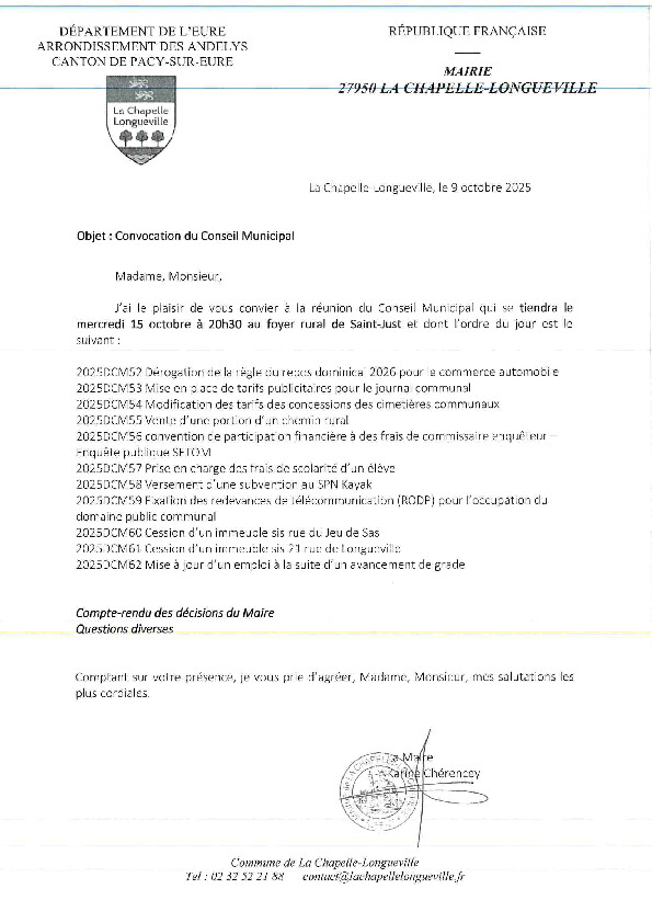 Le prochain conseil municipal aura lieu le mercredi 15 octobre 2025 à 20h30 au foyer rural de Saint-Just.
